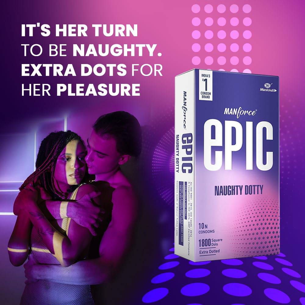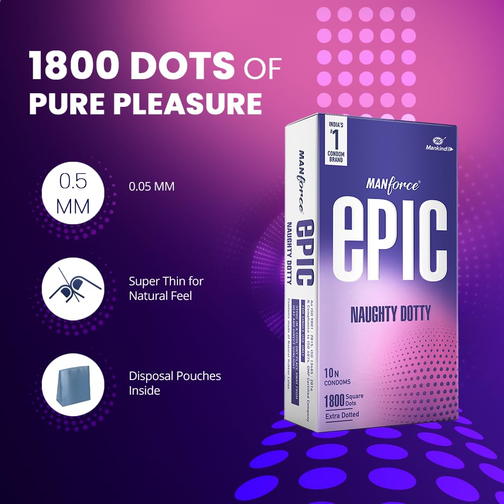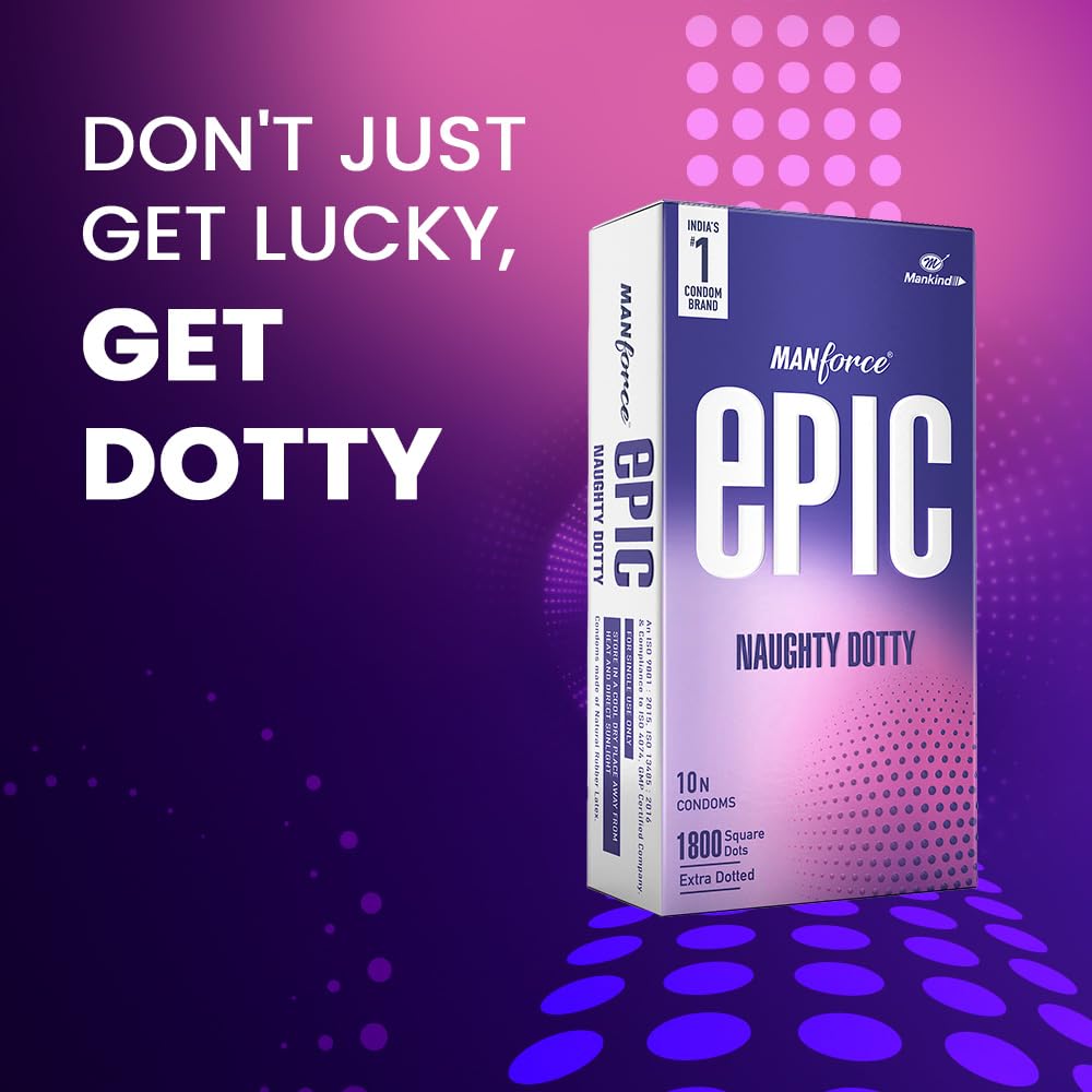 Manforce Epic Naughty Dotty Premium Condoms Extra Dotted with 1800 Square Dots | Latex, Lubricated, Vegan, Cruelty-Free - 10s Pack X 1 - Product Description :